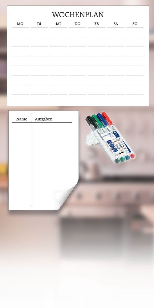 Folie direkt für den Schrank zum Selbstkleben, oder fertige Whiteboards mit allerhand Zubehör!